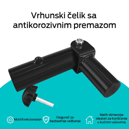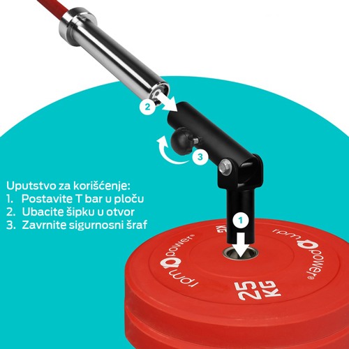 Lako se instalira pomoću sigurnog dugmeta: Ne trebaju dodatni alati i nije potrebno bušenje. Jednostavno umetnite 3 D zglob u tegove promera fI 50 (preko 15kg) i umetnite svoju olimpijsku šipku fi 50 u rukav, zategnite šipku pomoću sigurnosnog dugmeta, a zatim možete da počnete da koristite.