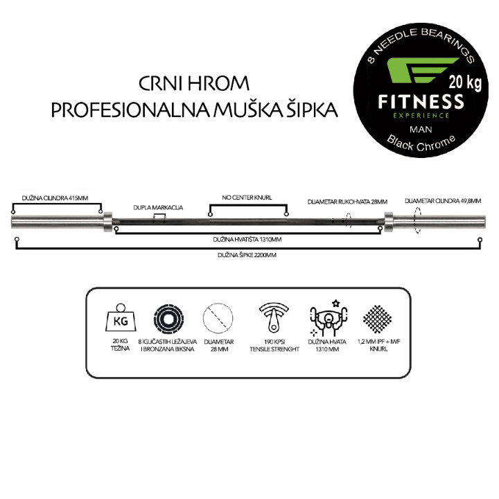 Fitness Experience CrossFit profesionalne šipke su pogodne za CrossFit, dizanje tegova i Powerlifting. Fitness Experience šipke su napravljene od čvrstog opružnog čelika 190.000 psi koji je ravan najboljim šipkama na svetu. Ove šipke mogu, zahvaljujući visokom kvalitetu legure čelika, da izdrže najekstremnije treninge i zadovolje najviše standarde. Fitness Experience CrossFit šipka sa cilindrima u tvrdom hromu je veoma precizna šipka, napravljena od jakog, elastičnog opružnog čelika sa visokokvalitetnom završnom obradom od crnog i tvrdog hroma. Rukavi su montirani sa mesinganim čaurama, dok 8 paralelnih igličastih ležajeva po cilindru obezbeđuju glatku rotaciju. Hvatište je obloženo visokokvalitetnim premazom od crnog hroma, dok su cilindri urađeni premazom od tvrdog hroma. Cilindri su opremljeni glatkom, ali neklizajućom završnom obradom. Narezivanje (randlovanje) obezbeđuje dovoljno prianjanje, bez povreda tokom intenzivnih vežbi. Ova CrossFit muška šipka je pogodna za upotrebu sa olimpijskim i bumper tegovima (50 mm).