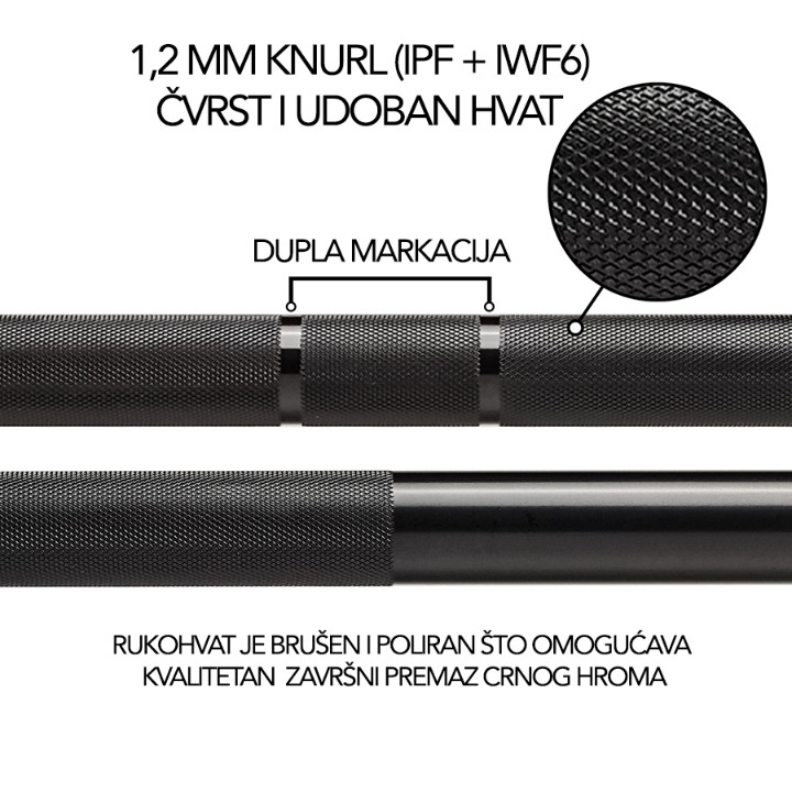 cilindri urađeni premazom od tvrdog hroma. Cilindri su opremljeni glatkom, ali neklizajućom završnom obradom. Narezivanje (randlovanje) obezbeđuje dovoljno prianjanje, bez povreda tokom intenzivnih vežbi. Ova CrossFit muška šipka je pogodna za upotrebu sa olimpijskim i bumper tegovima (50 mm).