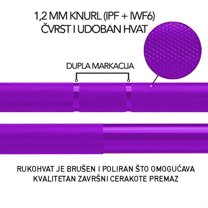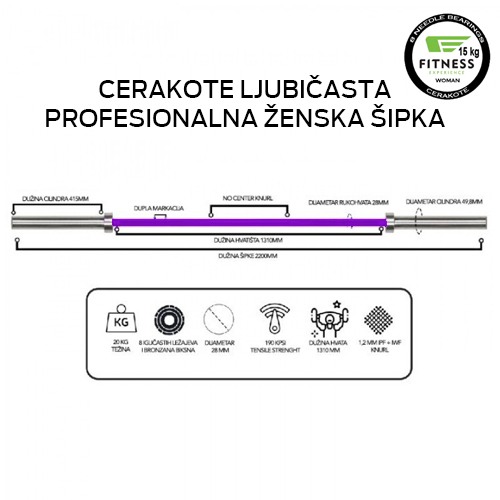 Fitness Experience CrossFit profesionalne šipke su pogodne za CrossFit, dizanje tegova i Powerlifting. Fitness Experience šipke su napravljene od čvrstog opružnog čelika 190.000 psi koji je ravan najboljim šipkama na svetu. Ove šipke mogu, zahvaljujući visokom kvalitetu legure čelika, da izdrže najekstremnije treninge i zadovolje najviše standarde. Fitness Experience CrossFit šipka sa cilindrima u tvrdom hromu je veoma precizna šipka, napravljena od jakog, elastičnog opružnog čelika sa visokokvalitetnom završnom obradom rukohvata od ljubičastog cerakot premaza i cilindra od tvrdog hroma. Rukavi su montirani sa mesinganim čaurama, dok 8 paralelnih igličastih ležajeva po cilindru obezbeđuju glatku rotaciju. Hvatište je obloženo visokokvalitetnim cerakote ljubičastim premazom, dok su cilindri urađeni premazom od tvrdog hroma. Cilindri su opremljeni glatkom, ali neklizajućom završnom obradom. Narezivanje (randlovanje) obezbeđuje dovoljno prianjanje, bez povreda tokom intenzivnih vežbi. Ova CrossFit muška šipka je pogodna za upotrebu sa olimpijskim i bumper tegovima (50 mm).