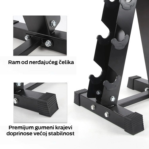 Prednosti ovog stalka su u fleksibilnost izbora težina bučica koje ćete odlagati. Ukupna nosivost je 150 kg, tako da na stalak mogu biti odložene i hex ili okrugle bučice težine i do 25kg na donjim policama.