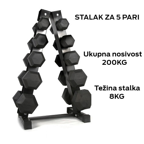Prednosti ovog stalka su u fleksibilnosti izbora težina bučica koje ćete odlagati na njega. Ukupna nosivost je 200 kg, tako da na njenu mogu biti odložene i hex ili okrugle bučice i do 25kg na donjim policama.