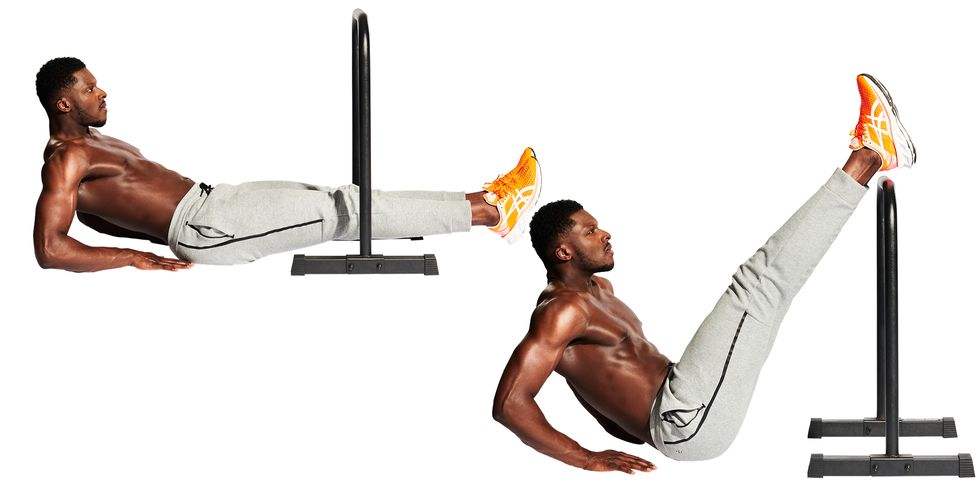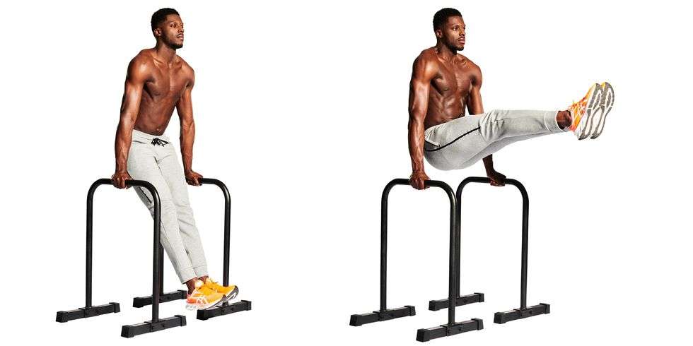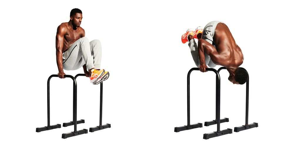 Uhvatite paralete tako da vam zglobovi budu postavljeni na vrh okvira i podignite se dok vam se stopala ne odvoje od poda (A). Ispružite noge ispred sebe i zadržite položaj u obliku slova L sa ispruženim nogama – zaključanim kolenima (B).