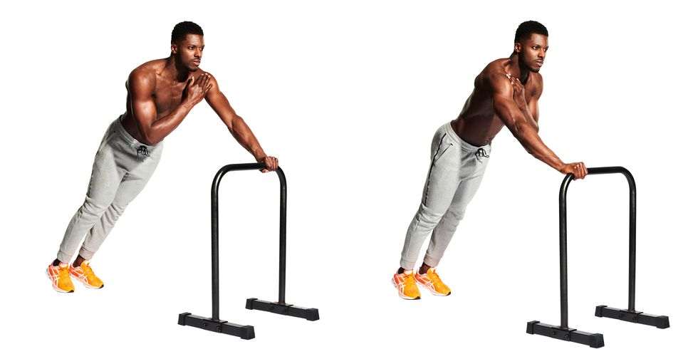 Stanite u sredinu paralete i uhvatite paralete sa obe ruke vodeći računa o položaju zglobova. Podignite stopala sa poda, savijajući se u kolenima (A). Polako se okrenite u laktove kako biste omogućili svom telu da se spusti (B), a zatim ispravite ruke da biste se ponovo podigli.
