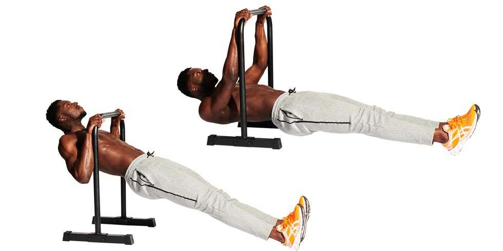 Lezite na leđa, sa grudima ispod paraleta. Uhvatite šipku drškom (A). Držeći telo ravno, povucite grudi prema šipci (B). Pauzirajte, zatim spustite i ponovite bez odmaranja na podu. Uradite 10 do 15 ponavljanja u 3 do 4 serije za razvoj izdržljivosti u snazi mišića leđa, ruku i core-a.