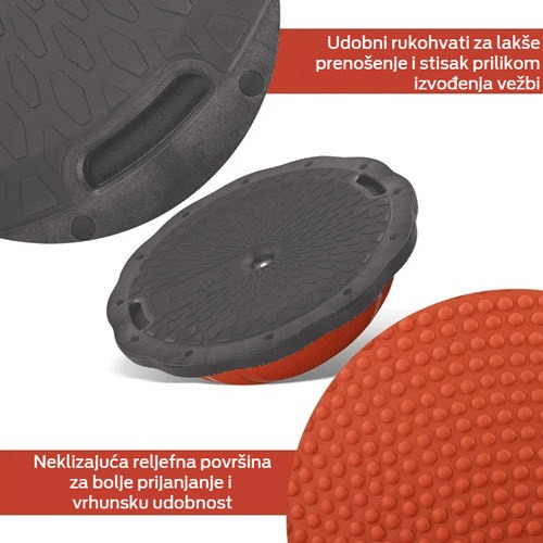 Premium Kvalitet Materijala: Sa visokokvalitetnom PVC konstrukcijom, ova bosu lopta pruža izuzetnu izdržljivost. Antiklizajuća površina i dno dodatno obezbeđuju stabilnost tokom vežbanja.