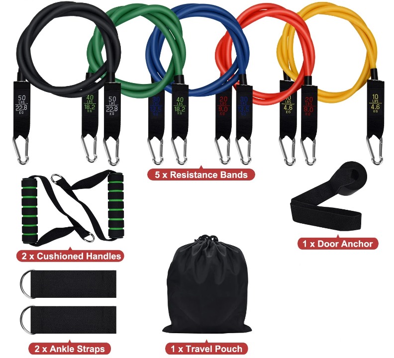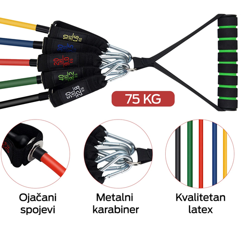 Kupovinom seta guma za vežbanje Extra Strong dobijate set guma sa pojačanim opterećenjem sa mogućnost izvođenja preko 150 vežbi za sve grupe mišića sa 31 kombinacijom opterećenja, od 4.6 kg do 68 kg.