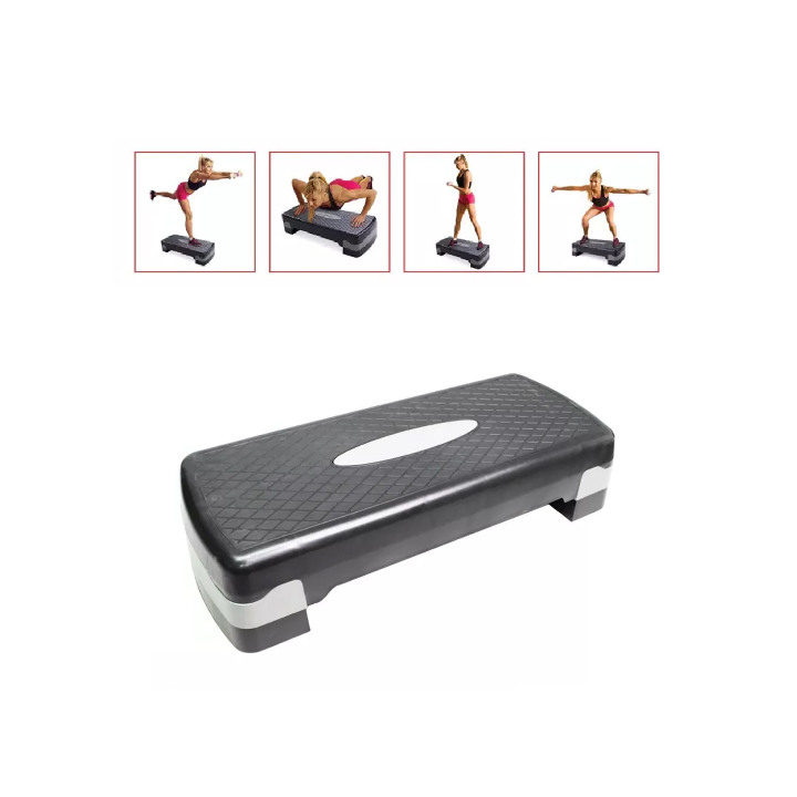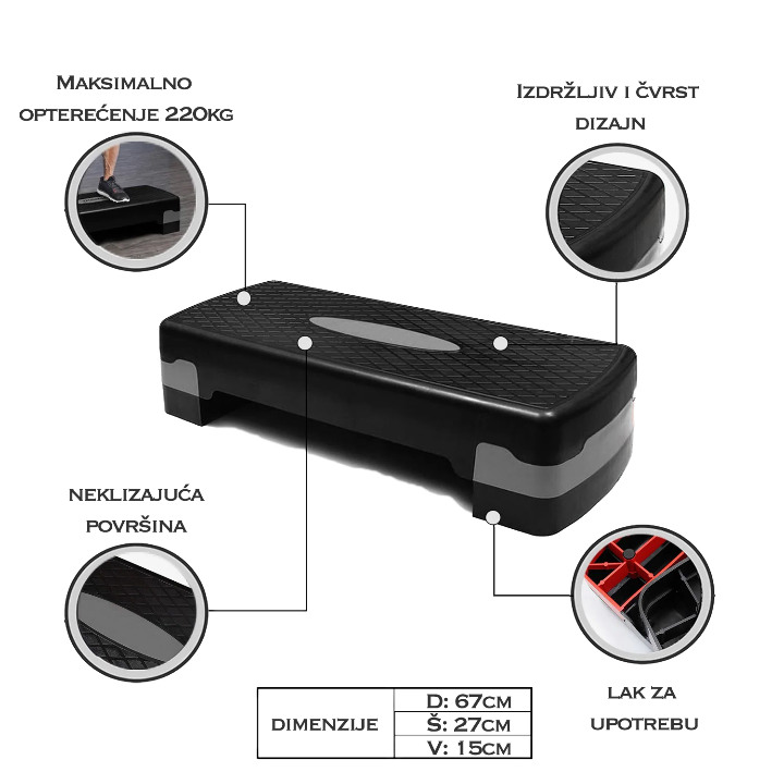 Steper za aerobik – klupa za Step aerobik sastoji se od crno – sive platforme i 2 crna potporna bloka. Steper za aerobik je izrađen od čvrste masivne plastike -visokozasićenog polietilena, koji je otporan na pucanje. Površina aerobik steper klupe prošarana je protivkliznim reljefnim šarama, dok se na donjem delu step aerobik klupe nalaze se potporne gumice koje sprečavaju klizanjene stepera, a pritom ne ostavljaju tragove na podlozi. Potporni blokovi Klupe za Step aerobik se jednostavno mogu podešavati na visine od 10cm i 15cm.