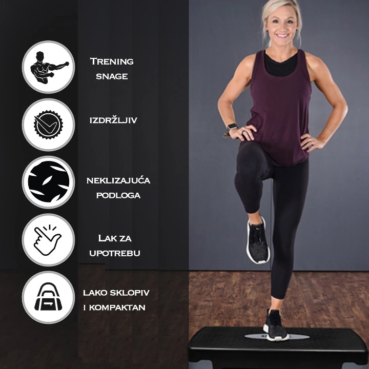 Step aerobik program vežbanja je zabavan i vrlo efikasan za razvoj kondicije i opšte izdržljivosti, a uz pomoć jednostavnih uputa sa interneta možete trenirati kod kuće. Sve što vam je potrebno za trening je ovaj povoljni steper za aerobik! Step aerobik trenažnim programom istovremeno se može razvijati snaga i kardio izdržljivost, oblikovati telo i skidati suvišne telesne masnoće! Baš zato je step aerobic preporuka mnogih fitnes stručnjaka. Step aerobic tranažni koncept ima naglasak na oblikovanju nogu, bokova i gluteusa, a uz pomoć jednoručnih bučica na steperu za aerobik efikasno se može jačati i gornji deo tela.